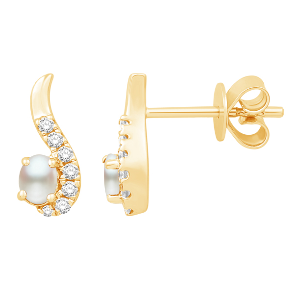 14K GOLD EARRINGS FEATURING DIAMONDS AND PEARL .
