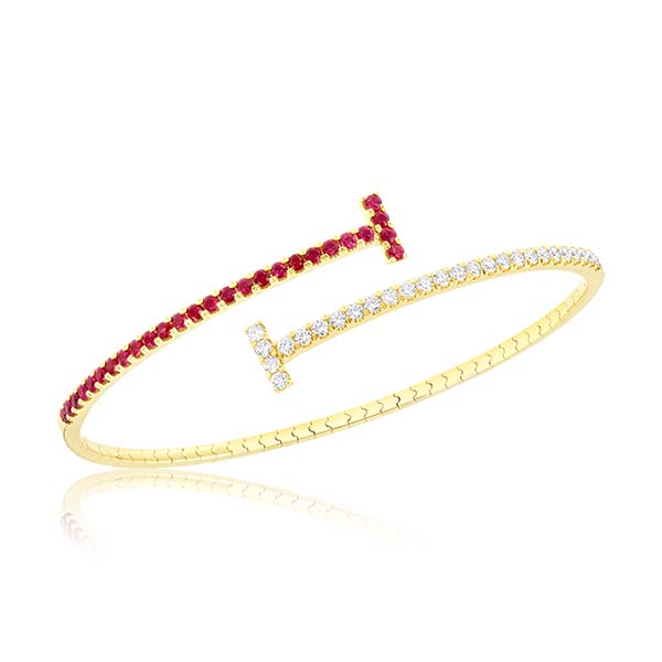 14K Yellow Gold Double T Over Lapping Flexible Bangle Featuring Round Diamonds And Ruby .Its Elegant ,Light Weight And Timeless . It Can Also Be Worn As Stackable .