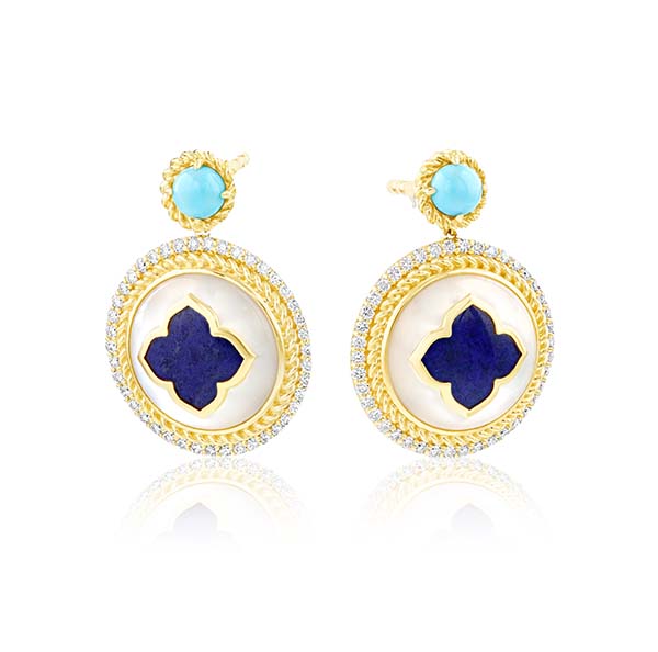 | 14K Yellow Gold Timeless Drop Earrings Featuring Round Diamonds ,Lapis ,White Mother Of Pearl And Cabochon Turquoise . |